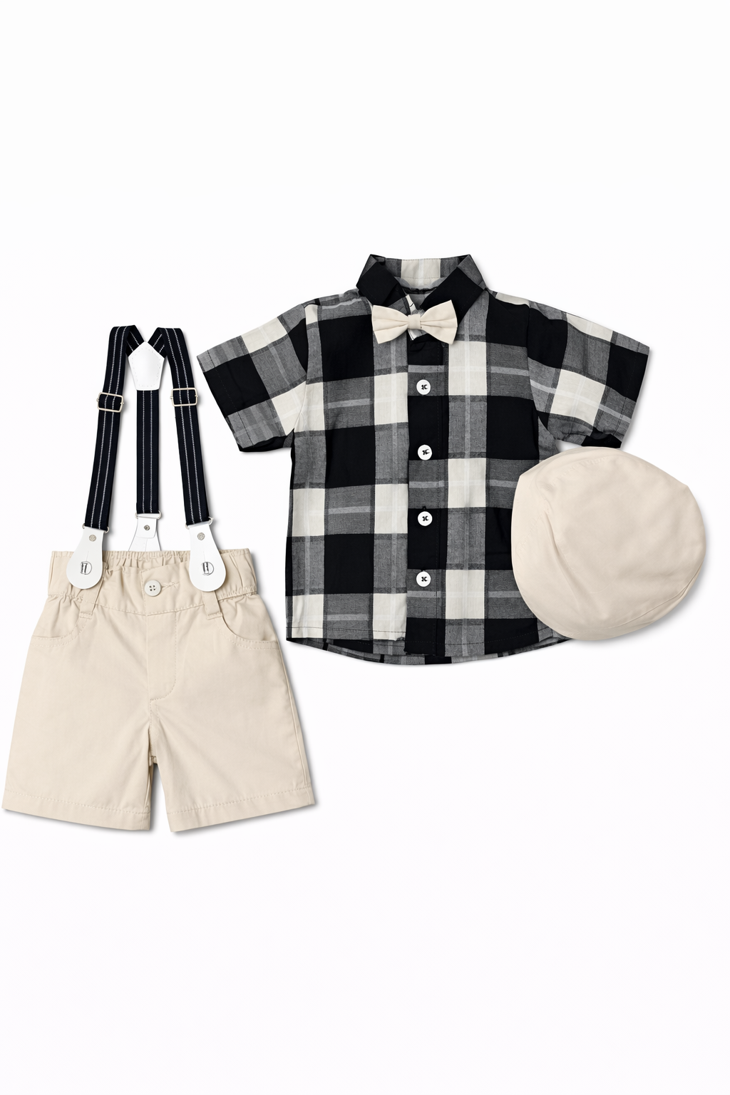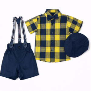 A stylish and trendy outfit featuring a half-sleeve checkered shirt paired with matching shorts, knot, gallace, and cap. Made from comfortable, breathable fabric for all-day wear. Perfect for parties, outings, and casual occasions.