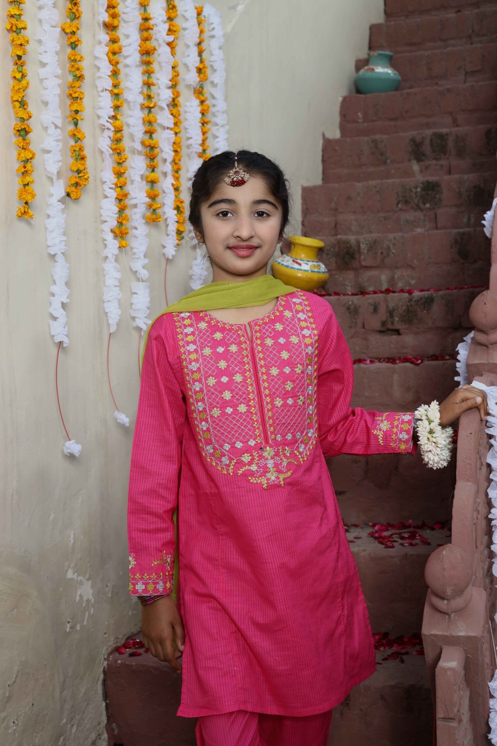 Embrace elegance with this Soft Self Cotton Pink Multi-Head Embroidered Suit. Crafted from premium self-cotton fabric, this suit offers a soft and breathable feel, perfect for all-day wear. Paired with matching trousers for a streamlined look, the ensemble is completed with a dupatta featuring stunning lace work.