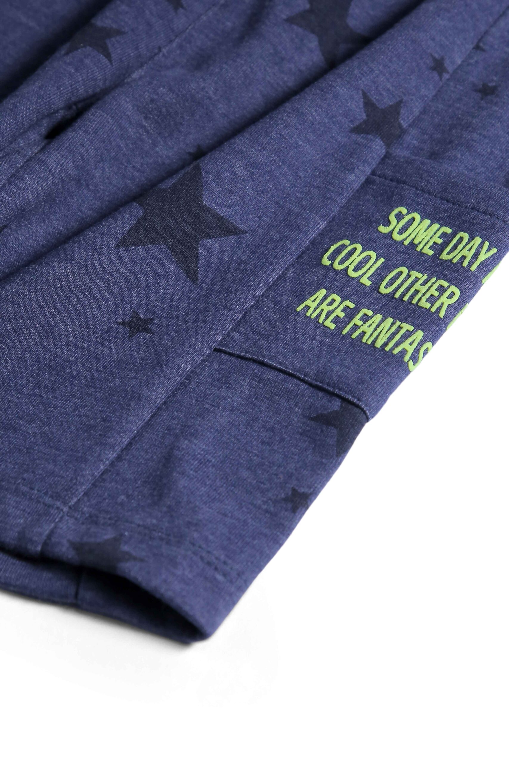 These navy star-printed shorts are the perfect blend of comfort and style. Crafted from high-quality jersey stretchable fabric, they offer a flexible, breathable fit that moves with you throughout your day. The standout design features a unique star print, enhanced with eye-catching puff printing on pocket that adds a textured, 3D effect for an elevated look.